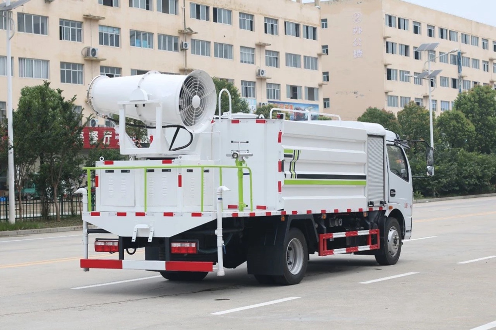 2.抑塵裝置采用國內(nèi)知名品牌,成霧量大、粒徑范圍大。霧炮噴射距離遠(yuǎn),且能實(shí)現(xiàn)俯仰角度可調(diào),滿足不同噴射距離工況的需求。使用副發(fā)動機(jī)驅(qū)動,傳動效率高。操作簡單,各功能通斷控制為電控氣動,一鍵切換,無需手動。