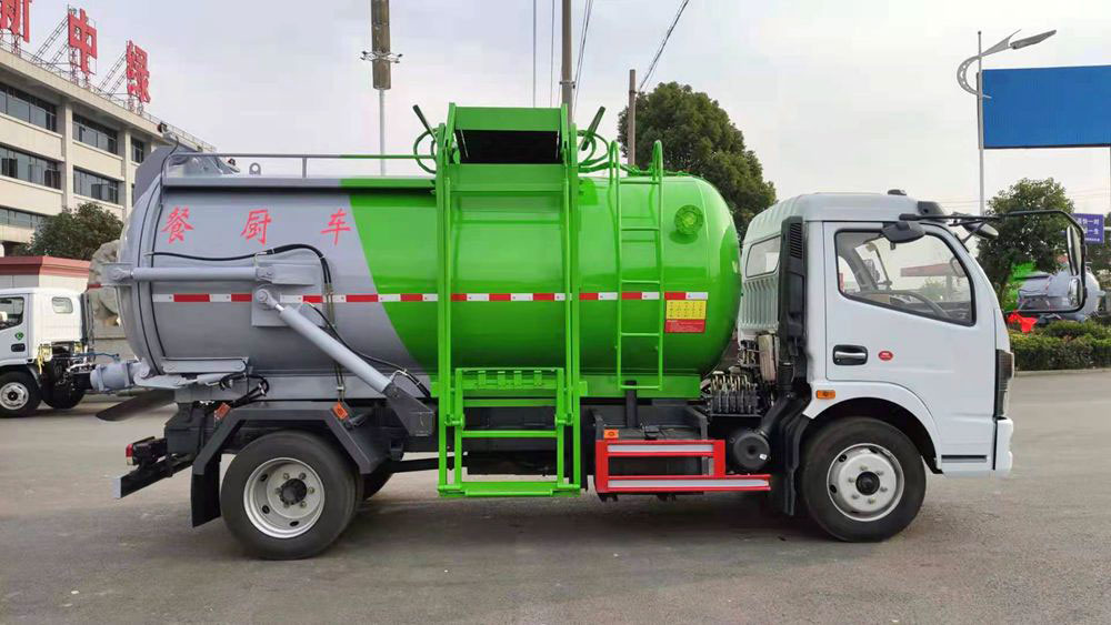 餐廚垃圾車,又稱餐余垃圾車、余廚垃圾車或者泔水車,餐廚垃圾車是垃圾車中的一種,是用于收集和運輸生活垃圾、食品垃圾(泔水)專用車輛。上裝由箱體、后門總成、后門開啟機構、密封鎖緊機構、推板機構、掛桶提升機構及操縱機構等組成。有裝、卸垃圾自動化程度高、工作可靠、密封性好、裝載容積大、操作簡便、作業過程密閉,無污水泄露和異味的散發,環保性好等特點。餐廚垃圾車不僅優化了居民居住的環境衛生,減少了空氣中的餐廚垃圾臭味,減少孳生蟑螂、細菌的可能, 改善了環衛作業環境,減少垃圾的四處分散造成的污染。